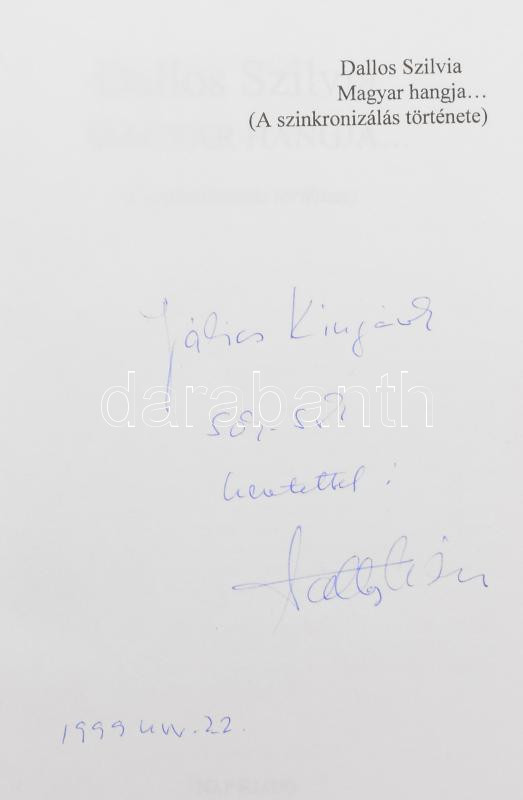 Dallos Szilvia: Magyar hangja... A szerző, Dallos Szilvia (1935-) színésznő, írónő által Jálics Kinga (1943-2019) kulturális újságíró, szerkesztő részére DEDIKÁLT példány. (A szinkronizálás története.) 1999, Nap Kiadó. Kiadói papírkötés.
