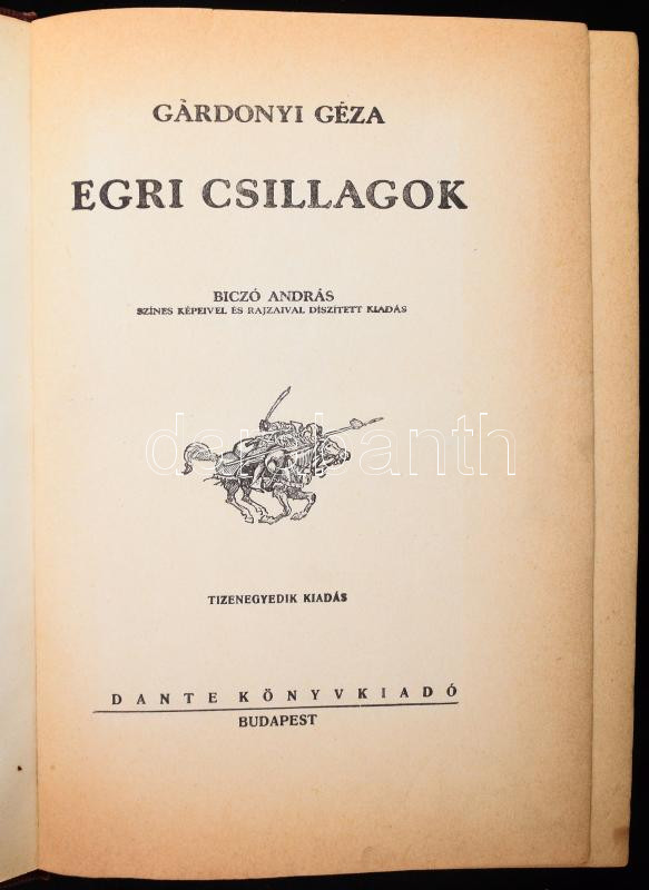 Gárdonyi Géza: Egri csillagok. I-II. köt. [Egybekötve]. Biczó András rajzaival. Bp., é.n., Dante, 332 p.; 323+(1) p. Oldalszámozáson kívül színes képtáblákkal. Átkötött félvászon-kötésben, kissé viseltes borítóval.
