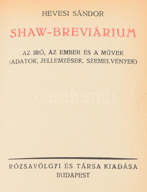 Hevesi Sándor: Shaw-breviárium. Az író, az ember és a művek. (Adatok, jellemzések, szemelvények). Bp., [1924], Rózsavölgyi és Társa, 359+(1) p. Első kiadás. Aranyozott, bordázott gerincű félbőr-kötésben, sérült gerinccel, belül nagyrészt jó állapotban.