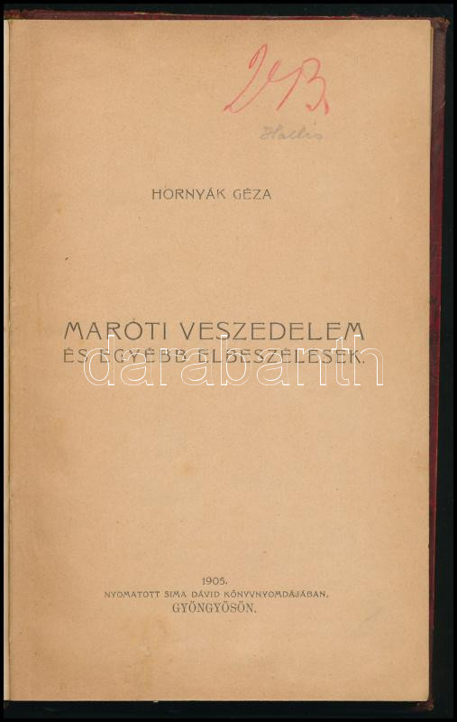 Hornyák Géza: Maróti veszedelem és egyéb elbeszélések. Gyöngyös, 1905, Sima Dávid-ny., 103+(1) p. Egyetlen kiadás. Aranyozott gerincű félbőr-kötésben, kissé kopottas borítóval, a gerincen sérülésekkel, helyenként kissé foltos lapokkal. Ritka! (Eddig csak egy példány szerepelt aukción!)