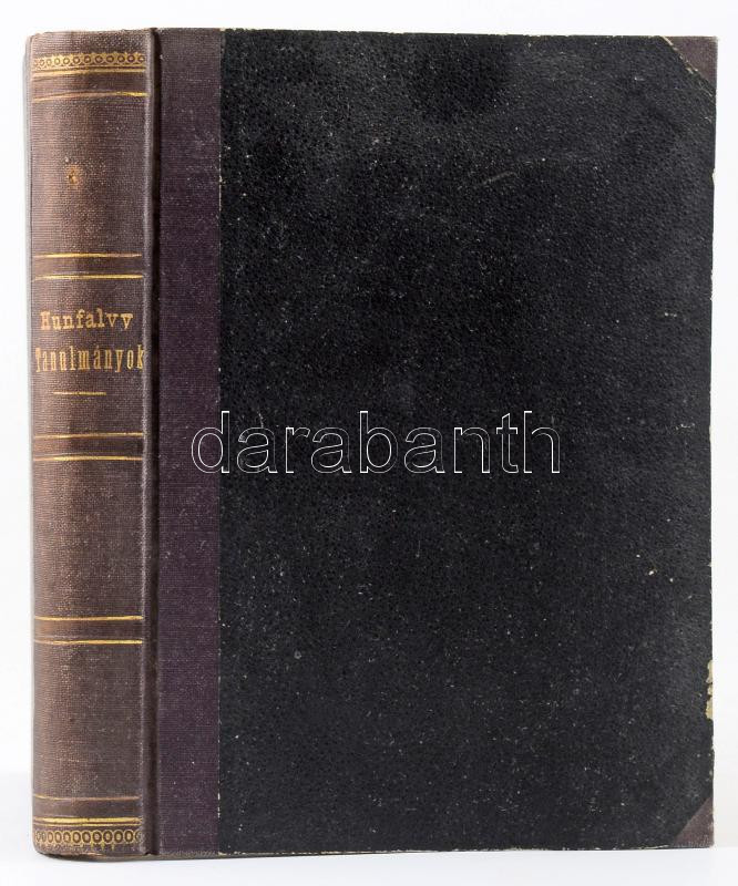 Leírás: Hunfalvy Pál: Tanulmányok. Bp., 1881, Ráth Mór, IX+(3)+368+(2) p. Második kiadás. Aranyozott gerincű félvászon-kötésben, helyenként kissé foltos lapokkal, tulajdonosi névbejegyzéssel.