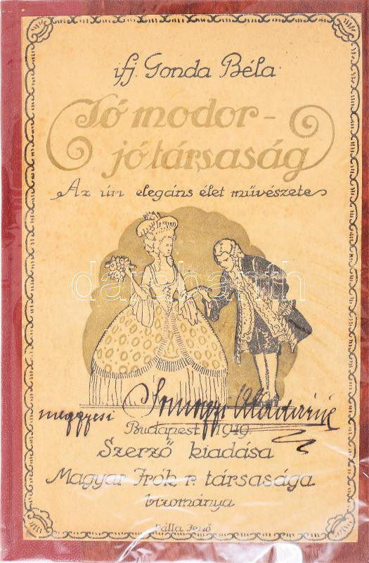 Ifj. Gonda Béla: Jó modor - jó társaság. Az úri elegáns élet művészete. Bp., 1919.,Szerzői. 187p. A borító Palla Jenő munkája. Egészvászon kötésben, az eredeti papírborító felhasználásával