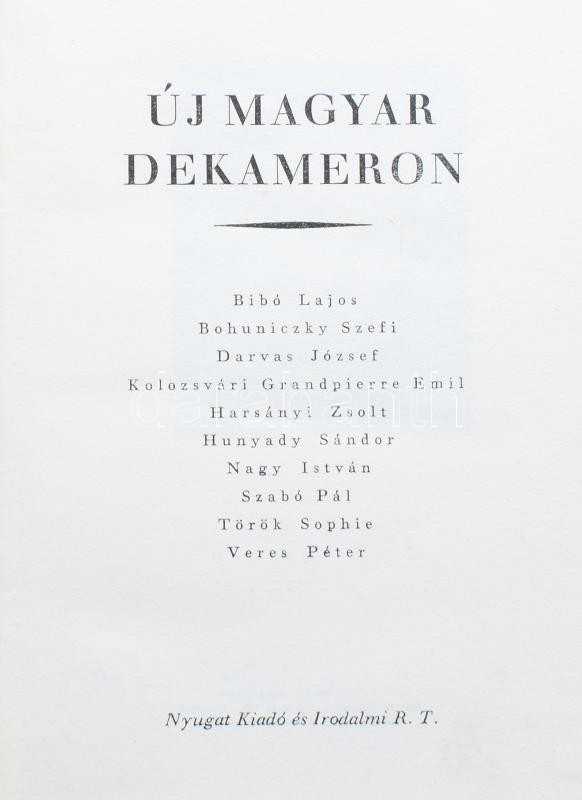 Illyés Gyula (szerk.): Új magyar dekameron. I-II. köt. Bibó Lajos, Kolozsvári Grandpierre Emil, Kodolányi János, Márai Sándor, Cs. Szabó László, Tamási Áron, Török Sophie és mások írásaival. (Bp., 1942), Nyugat, 241+(3) p.; 242+(2) p. Kiadói aranyozott félvászon-kötés.