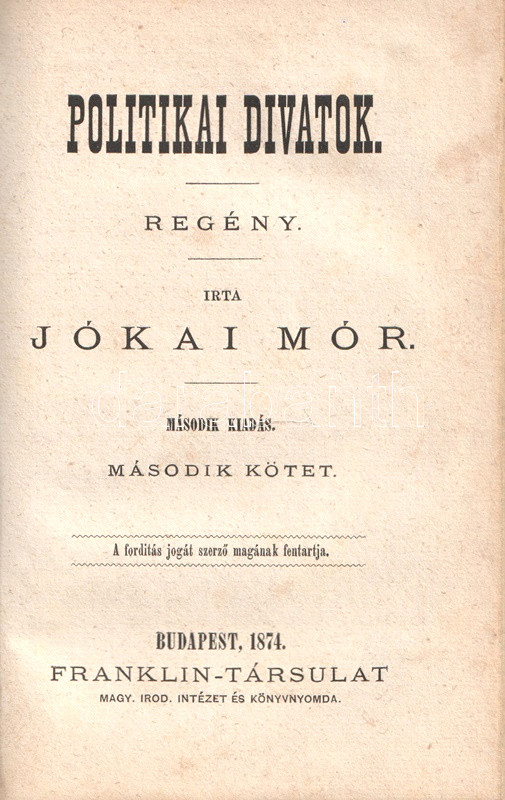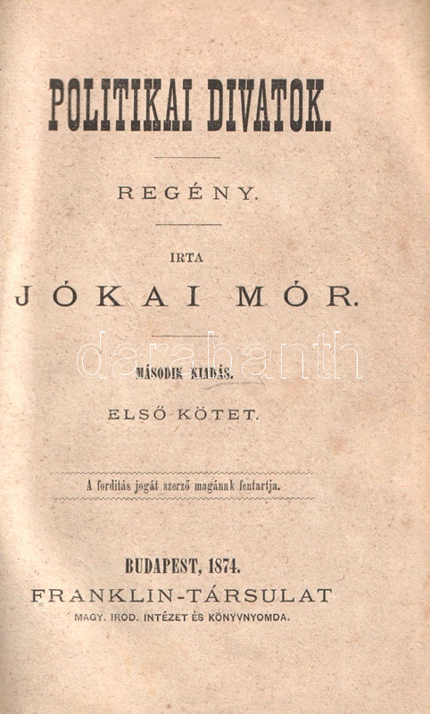 Budapest, 1874. Franklin-Társulat Magyar Irodalmi Intézet és Könyvnyomda. 289 [helyesen 299] + [3] p.; 241 + [1] p.; 151 + [3] p.