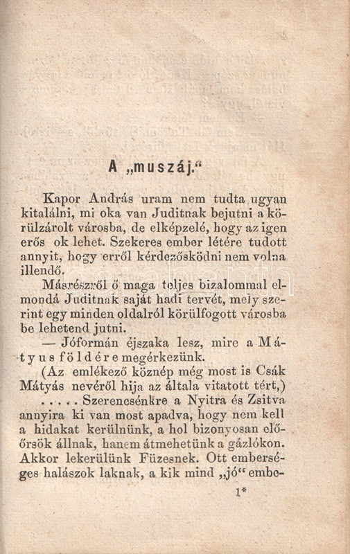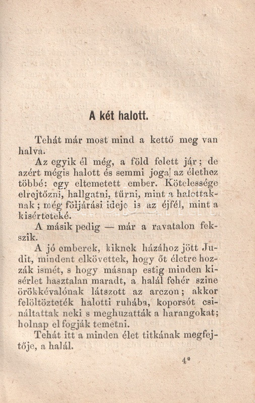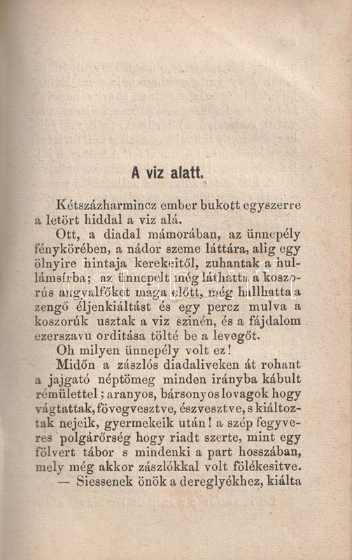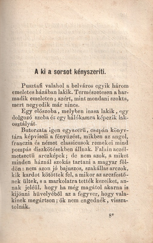 Jókai Mór önéletrajzi elemeket is felvonultató, szabadságharc alatti és utáni időket megjelenítő politikai kalandregénye legjelentősebb írói korszakának kezdetén, 1862-1863-ban jelent meg először. Példányunk a mű második kiadásából származik. 1874-ből származó példányunk érdekessége, hogy míves kötése jó évtizeddel későbbről származik. Kötetünk könyvkötője, a műhelyét 1879-ben felállító Gottermayer Nándor e kék, aranyozott, festett egészvászon kötéstípus kliséjét kimondottan az 1885-1893 között megjelenő Jókai-újrakiadásokhoz használta, példányunk a kiadó raktárában maradt, korábbi kiadásból származik, melyet később újra piacra dobtak.