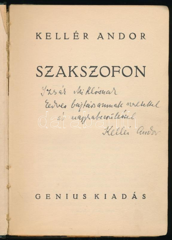 Kellér Andor: Szakszofon. (Regény). A szerző, Kellér Andor (1903-1963)... https://www.darabanth.com/hu/502-Gyorsarveres/502.0/Konyvek/Konyvek-Egyeb-ritkasagok~2500020/Keller-Andor-Szakszofon-Regeny-A-szerzo-Keller-Andor-1903-1963-iro-ujsagiro-altal~II3412178