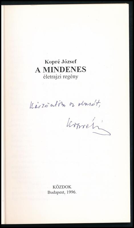 Kopré József: A mindenes. Életrajzi regény. A szerző által DEDIKÁLT! Bp., 1996, KÖZDOK. 119 p. Kiadói papírkötés, sérült gerinccel, kissé kopott borítóval.