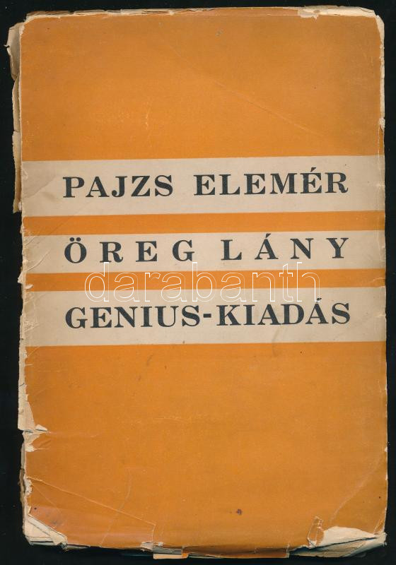 Pajzs Elemér: Öreg lány. A szerző, Pajzs Elemér (szül. Schön) (1894-1944) író, kabarészerző, műfordító, újságíró által Havas András Károly (1895-1945) újságíró, szerkesztő, műfordító részére dedikált példány. Bp., 1929, Genius, 117+(3) p. Egyetlen kiadás. Kiadói papírkötés, erősebben sérült borítóval és gerinccel, helyenként kissé sérült lapszélekkel, részben szétváló fűzéssel, az 1-24. oldalak kijárnak.