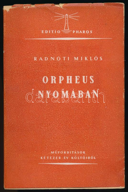 Radnóti Miklós: Orpheus nyomában. Műfordítások kétezer év költőiből. (Budapest, 1943). Pharos kiadóvállalat (Hellas Irodalmi és Nyomdai Rt.) 191 + [1] p. Első kiadás. A költő műfordításait egész oldalas, fametszetű költő-portrék kísérik. A kötet végén Radnóti Miklós rövid esszéje műfordítási elveiről. Színes, Csillag Vera által illusztrált kiadói papírkötésben, jó állapotban.