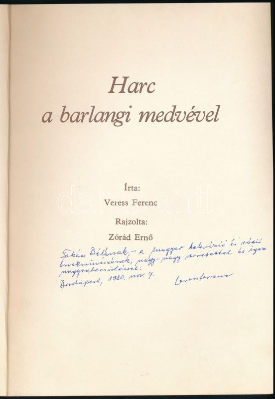 Veress Ferenc: Harc a barlangi medvével. Zórád Ernő rajzaival. A szerző, Veress Ferenc (1908-1983) feltaláló, költő, festő által dedikált példány. (Bp., 1979, Statisztikai Kiadó Vállalat-ny.), 30+(2) p. Kiadói papírkötés, kissé koszos borítóval.