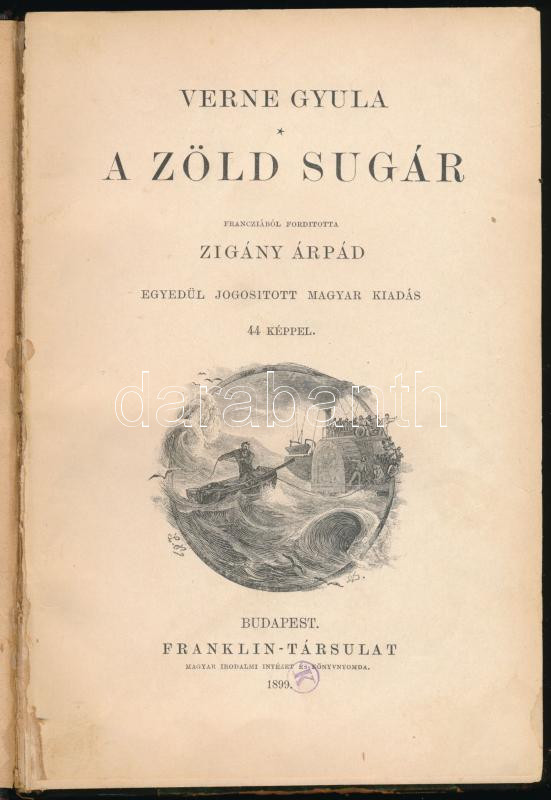 Verne Gyula: A zöld sugár. Ford.: Zigány Árpád. Bp., 1899, Franklin-Társulat, 237+(3) p. Első magyar kiadás. Egészoldalas fekete-fehér illusztrációkkal. Átkötött félvászon-kötésben, kissé viseltes, kopottas borítóval, néhány kissé sérült, a fűzéstől elváló, kijáró lappal.