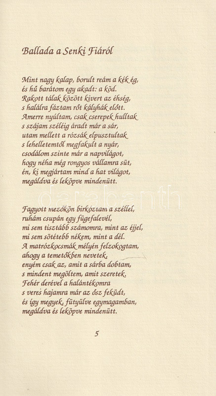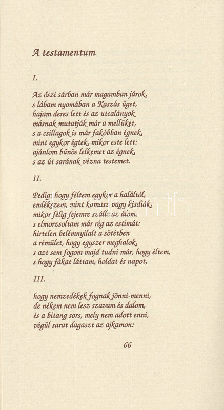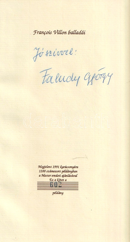 Aláírt kolofon: Megjelent 1991 karácsonyára 1200 számozott példányban a Mester eredeti ajánlásával. Ez a kötet a 602. példány. "Jó szívvel: Faludy György".