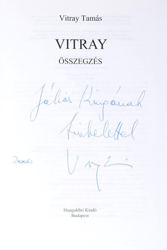 Vitray Tamás: Vitray. Összegzés. A szerző, Vitray Tamás (1932-) Kossuth-díjas újságíró, főszerkesztő által Jálics Kinga (1943-2019) kulturális újságíró, szerkesztő részére DEDIKÁLT példány. [Bp.], 2000,Hungalibri. Kiadói kartonált papírkötés, jó állapotban.