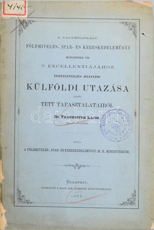 dr. Thanhoffer Lajos: A nagyméltóságú Földmíves-, ipar- és kereskedelemügyi miniszter úr ő excellentiájához tiszteletteljes jelentése külföldi utazása alatt tett tapasztalatairól .Bp., 1877. M. k. Egyetemi. 68p. Kissé sérült papírborítóval.