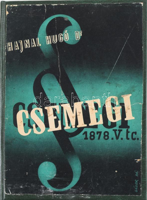 Hajnal Hugó: Csemegi Károly, a magyar bűntetőtörvénykönyv s a bírói szervezeteről szóló törvény megalkotójának élete és működése. (Bp., 1943), Pesti Lloyd-ny., 155+(1) p. Első kiadás. Átkötött egészbőr-/műbőr-kötésben, helyenként kissé foltos lapokkal, a címlapon tulajdonosi bélyegzővel.