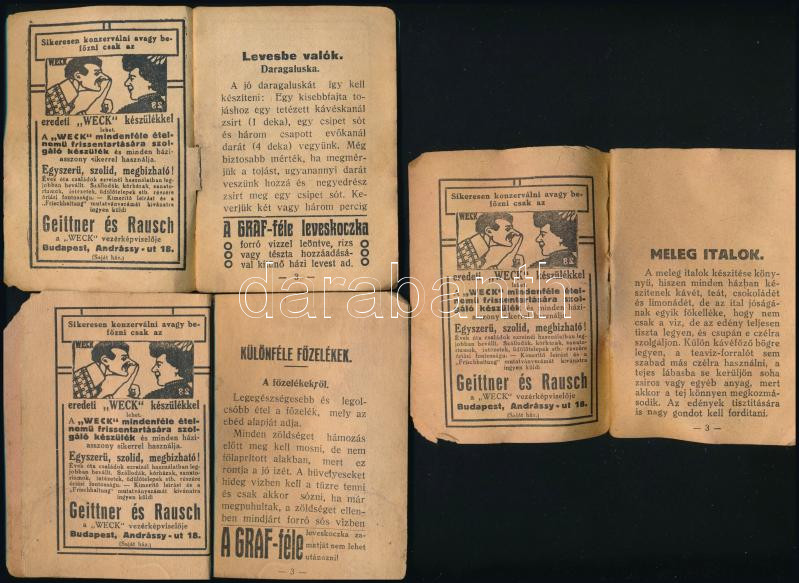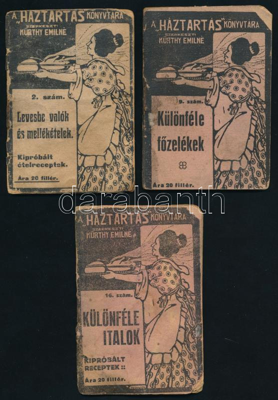 A ,,Háztartás" Könyvtára 3 füzete: Levesbe valók és mellékételek. Kipróbált ételreceptek. (2. sz.); Különféle főzelékek. (9. sz.); Kipróbált receptek. Különféle italok. (16. sz.) Szerk.: Kürthy Emilné. Bp., é.n., ,,Háztartás" Magyar Asszonyok Lapja. Kiadói tűzött papírkötés, viseltes állapotban, sérülésekkel, ázásnyomokkal, két szám különvált elülső borítóval.