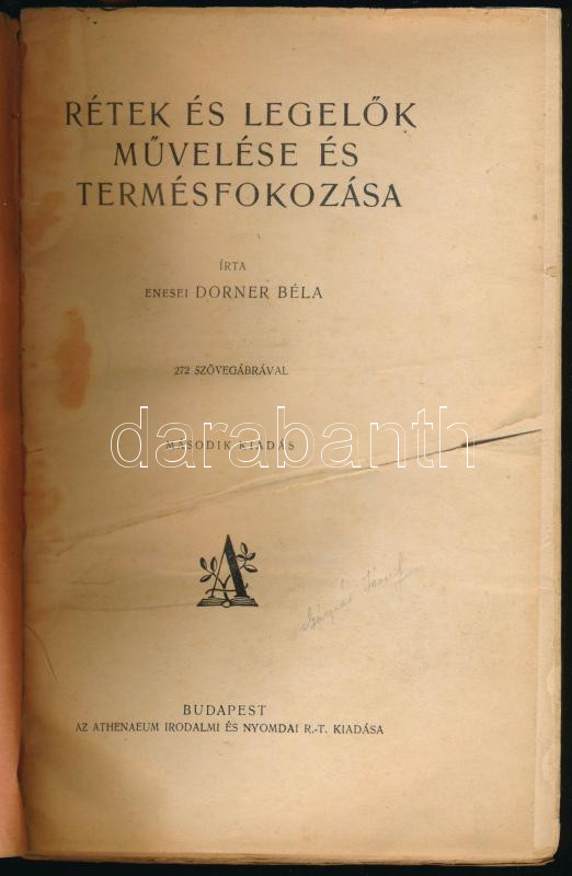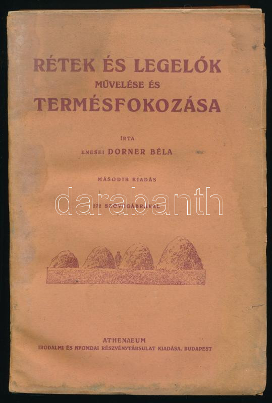 Dorner Béla, enesei: Rétek és legelők művelése és termésfokozása. Bp., [1929], Athenaeum, 360 p. Második kiadás. Kiadói papírkötés, sérült borítóval és gerinccel, ázásnyomokkal, sérült címlappal, helyenként kissé foltos lapokkal, nagyrészt felvágatlan.
