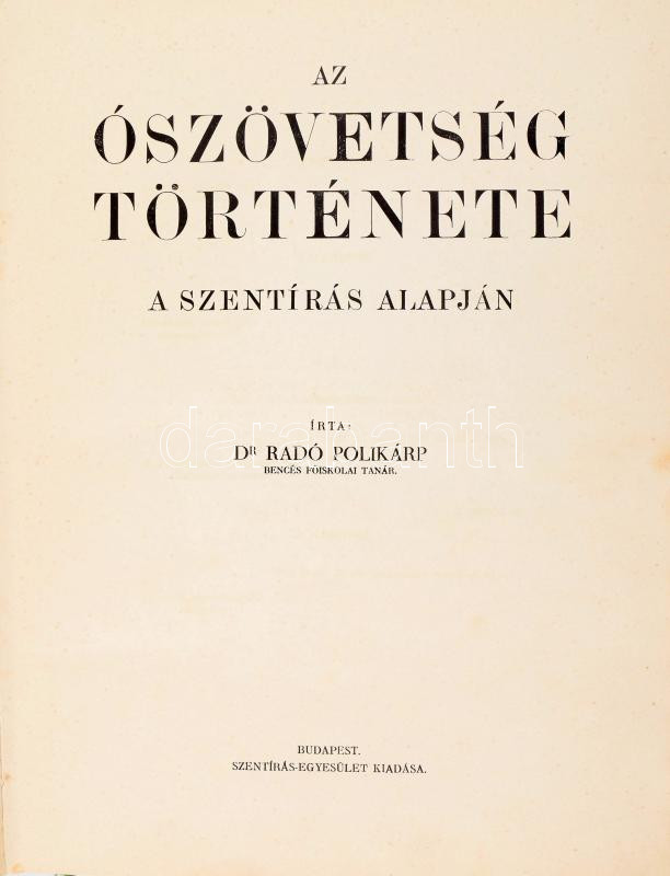 Radó Polikárp: Az Ószövetség története a Szentírás alapján. Bp., 1937, Szentírás-Egyesület, 285+(3) p.+ 40 t. Kiadói aranyozott, dombornyomott egészvászon-kötés, nagyrészt jó állapotban, a borítón némi letisztítható folttal, gerincen miniatűr sérüléssel .