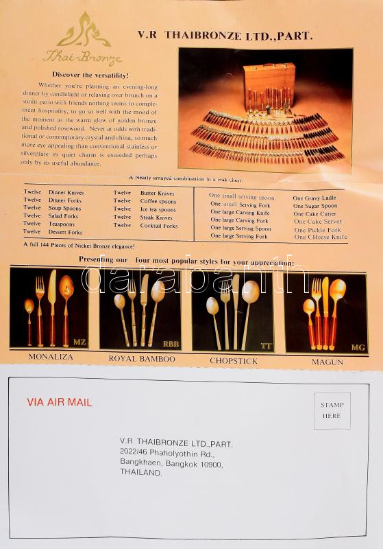 144 részes thaiföldi bronz evőeszköz készlet, jelzett, rózsafa díszdob... https://www.darabanth.com/hu/502-Gyorsarveres/502.0/Mutargy-papirregiseg-egyeb/Bolhapiac~1500010/144-reszes-thaifoldi-bronz-evoeszkoz-keszlet-jelzett-rozsafa-diszdobozban~II3413980