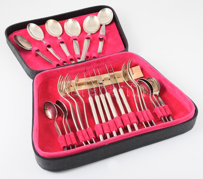 Leírás: 6 személyes 24 részes evőeszköz készlet, tartójában.