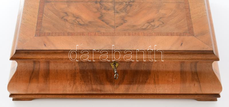 Leírás: Biedermeier stílusú gyökérintarziás díszdoboz. Kulccsal, zárja hibás, 22x29 cm