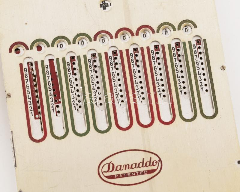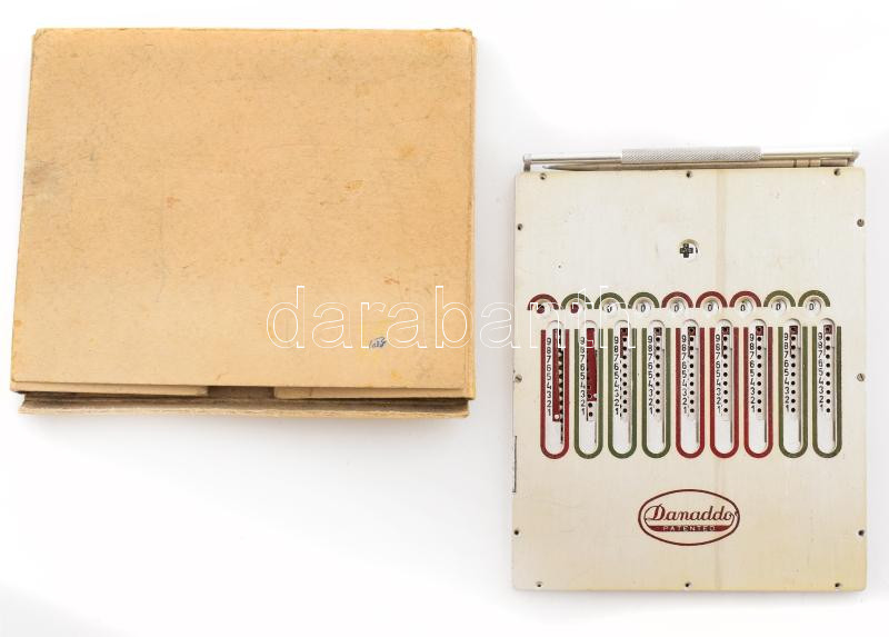 Danaddo magyar gyártmányú kézi számológép (összeadó és kivonó), gyártó: Danuvia Ipari és Kereskedelmi Rt., 1949. Alumínium, fogasléces működésű, egyszeres automatikus tizesátvitellel, 9 számjegy kapacitás, dobozában, 15x13 cm