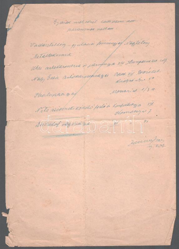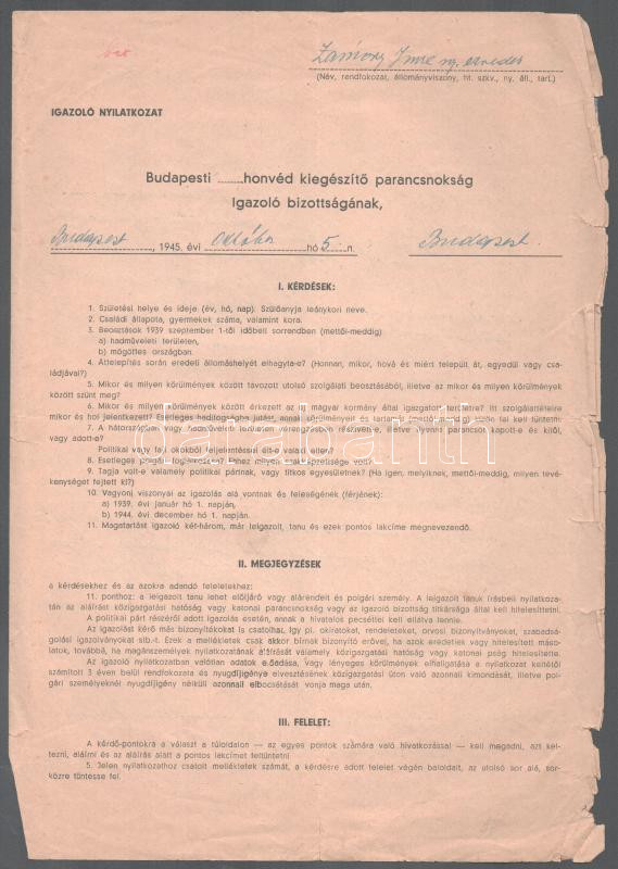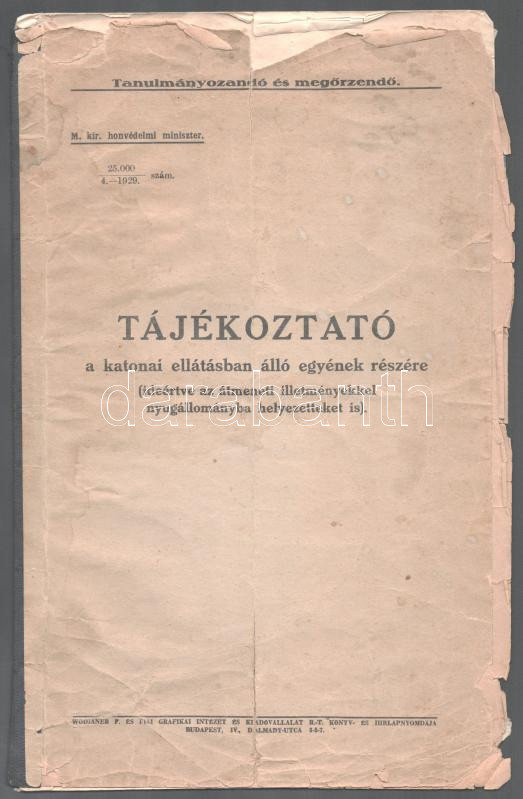 1929 Tájékoztató a katonai ellátásban álló egyének részére, benne: Zámory Imre ezredes igazoló nyilatkozata 1945-ből (A vadásztöltény és gyutacsgyár hadüzem parancsnoka), sérült