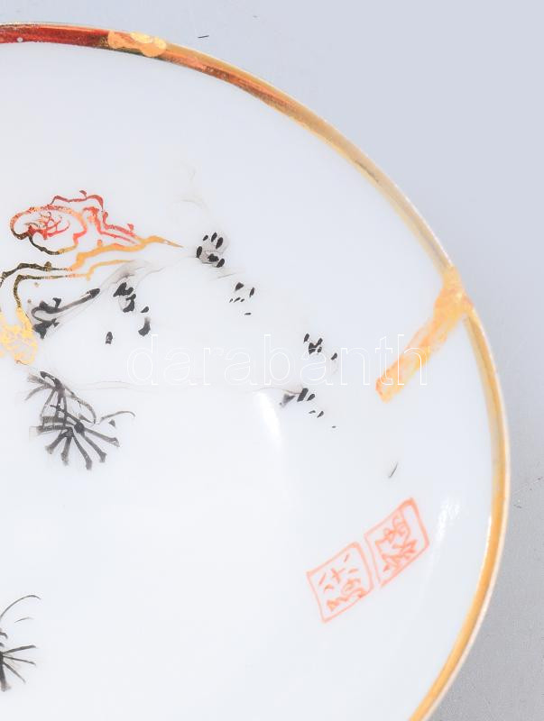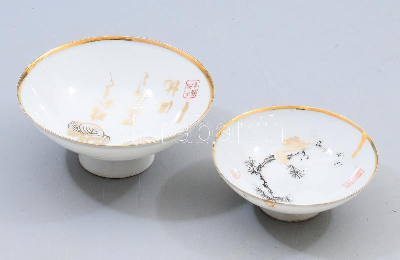 Leírás: 2 darab japán porcelán katonai szakés csésze. cca 1940-1944, klf motívumokkal és kalligráfiával díszítve, sérüléssel, d: 9-11 cm