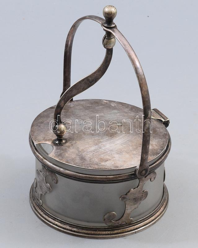 Leírás: cca 1930 Art deco billenős fedelű szószkínáló, üveg betéttel, jelzett, m: 16 cm