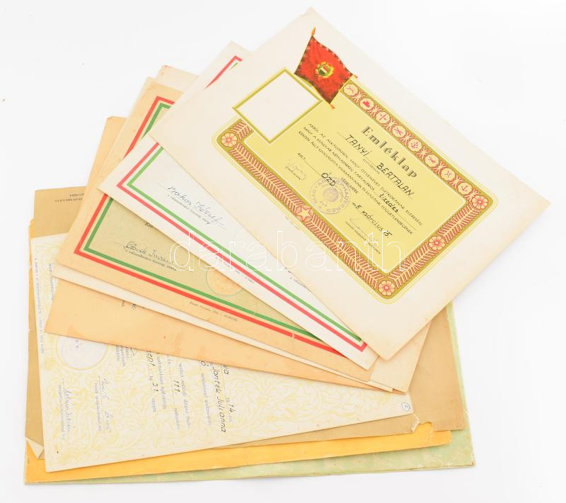 Vegyes szocialista oklevelek, összesen 15 db, közte Magyar Néphadsereg emléklap tartalékos tizedes részére, szakmunkás bizonyÃtvány, Bányász Szolgálati Érdemérem és Tanácsköztársasági Emlékérem adományozó oklevelek, stb., változó állapotban