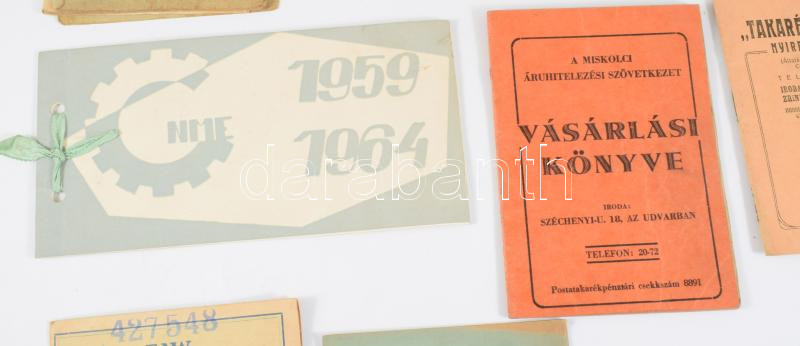 cca 1930-1965 Vegyes papírrégiség tétel: Magyar Dolgozók Országos Hivatásszervezete Alapszabályai, vásárlási könyvek, 1939-es zsebnaptár, stb., összesen 10 db