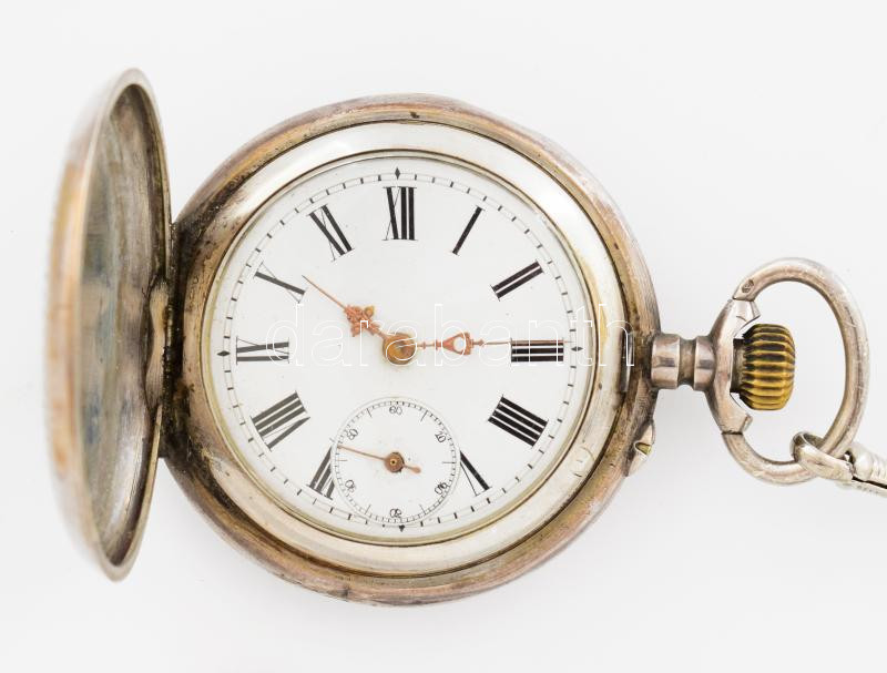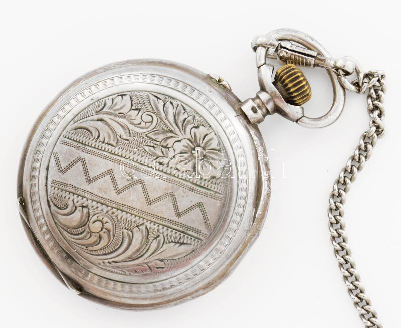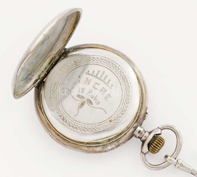 Leírás: Ancre 15 köves ezüst (Ag) tokos zsebóra, fém óralánccal, működik, jelzett, d: 5 cm, bruttó 94g