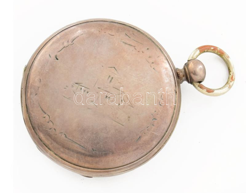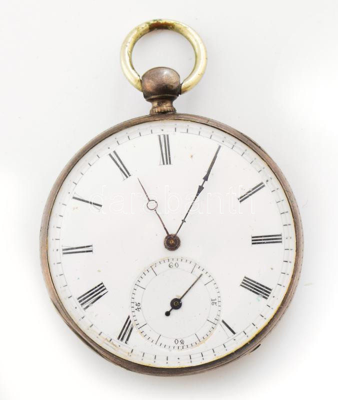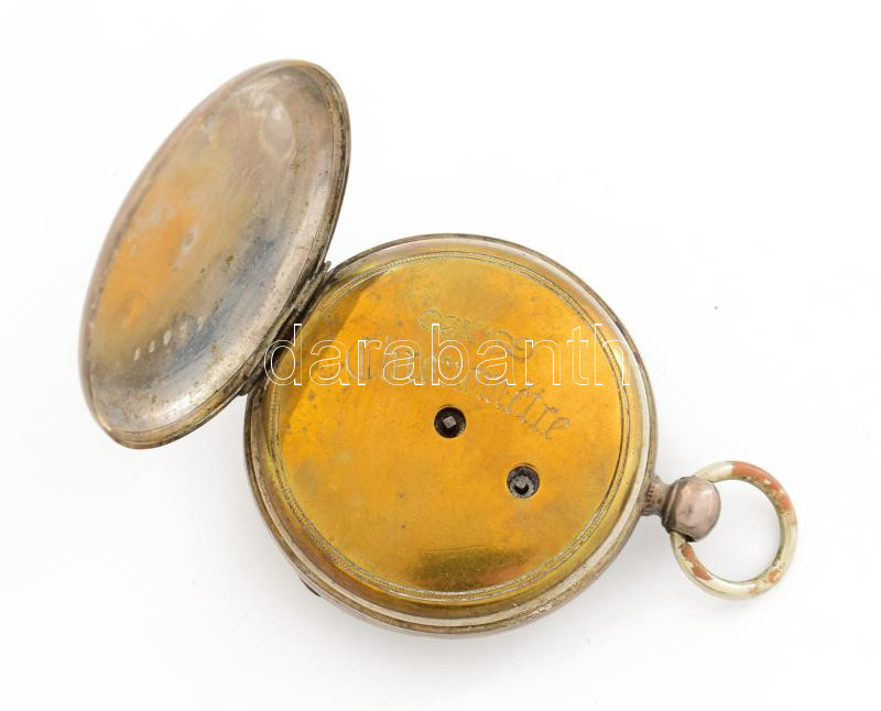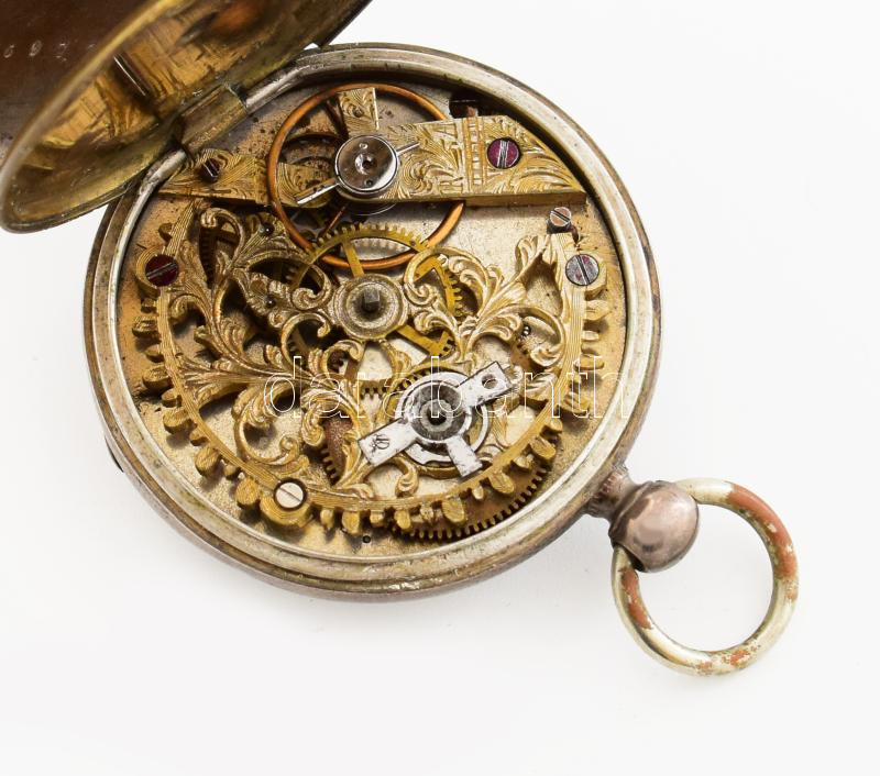 Leírás: Antik részben ezüst (Ag) tokos zsebóra, eredeti fazettált üveggel, kulcs nélkül, d: 42 mm