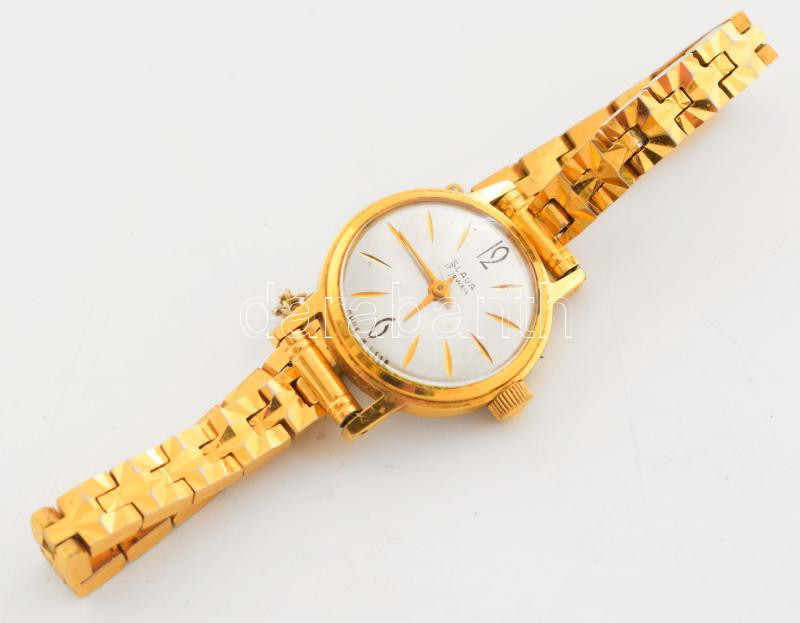 Leírás: Slava 17 köves aranyozott női karóra, mechanikus, karcokkal, működik, d: 2 cm