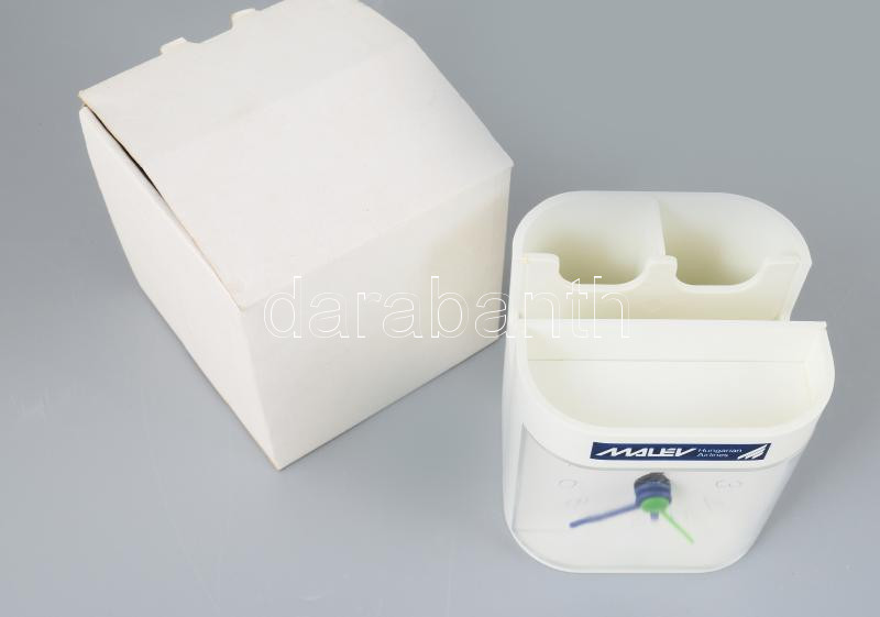 Leírás: Malév íróasztali tolltartó, órával, eredeti dobozában, szép állapotban 11 cm