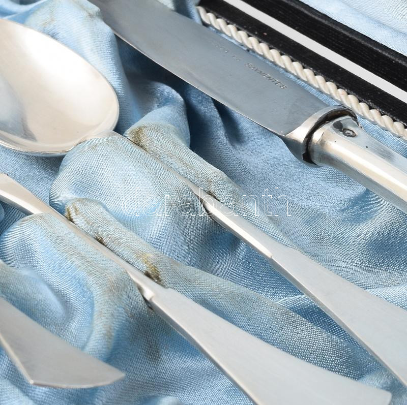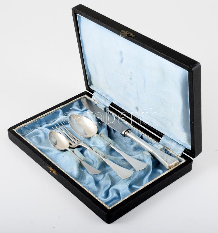 Leírás: Ezüst (Ag) egyszemélyes keresztelő készlet, benne ezüst (Ag) nyelű késsel, jelzett, bruttó 134g, díszdobozban