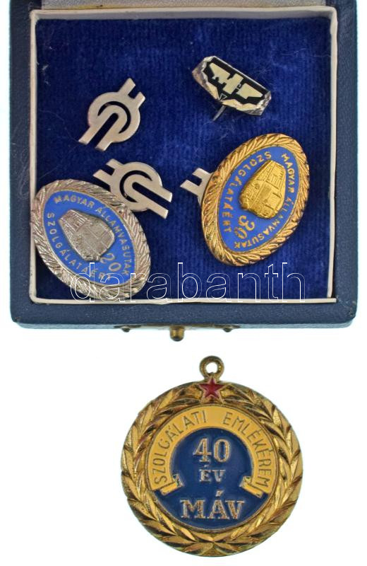 1980 k. "MÁV Szolgálati Emlékérem 40 év" műgyantás jelvény mellszalag nélkül + "Magyar Államvasutak szolgálatáért" (2xklf) 20 és 30 év után járó MÁV törzsgárda jelvény + 3db "MÁV" logót ábrázoló fém jelvény + "KTF" műgyantás fém jelvény, együtt, tokban T:AU,XF