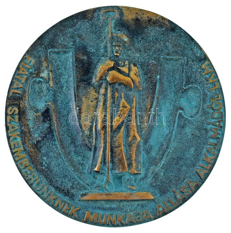 DN(~1970) Lenin Kohászati Művek "Fiatal szakemberünknek munkába állása alkalmából - LKM" egyoldalas, öntött bronz emlékérem, hátlapján műbőr anyag darabbal, ami elkezdett leválni (116mm) T:XF, patina