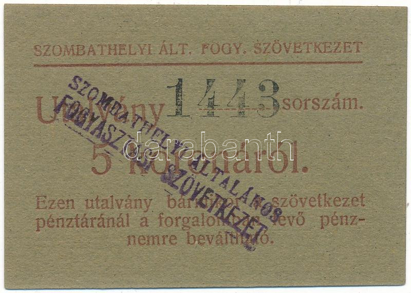 1919 Szombathely 1919. május 6. 5K "Szombathelyi Általános Fogyasztási Szövetkezet", "1443" sorszámmal T:AU / Hungary / Szombathely 6th May 1919. 5 Korona "Szombathely General Consumer Cooperative", with "1443" serial number C:AU