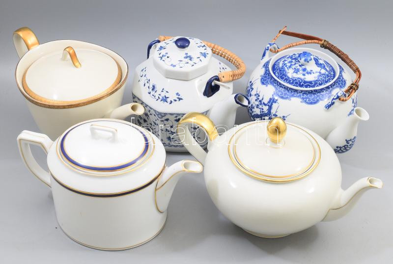 Leírás: 5 darab klf porcelán teás kanna, közte az 1920-as évekből, jelzett, hibátlan, m: 16 cm alatt