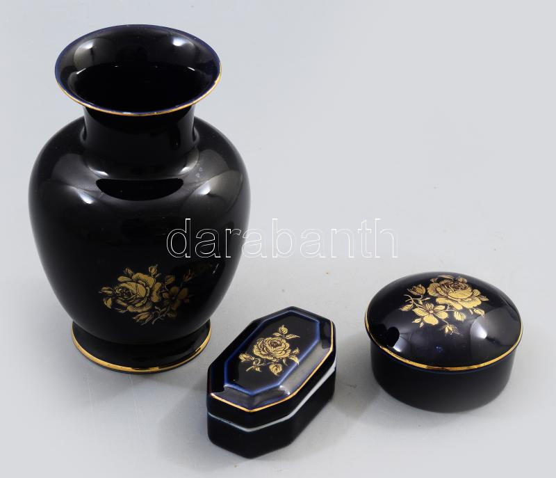 Leírás: Hollóházi kobaltkék festésű váza és 2 darab ékszertartó edény, jelzett, hibátlan, m: 14,5 cm