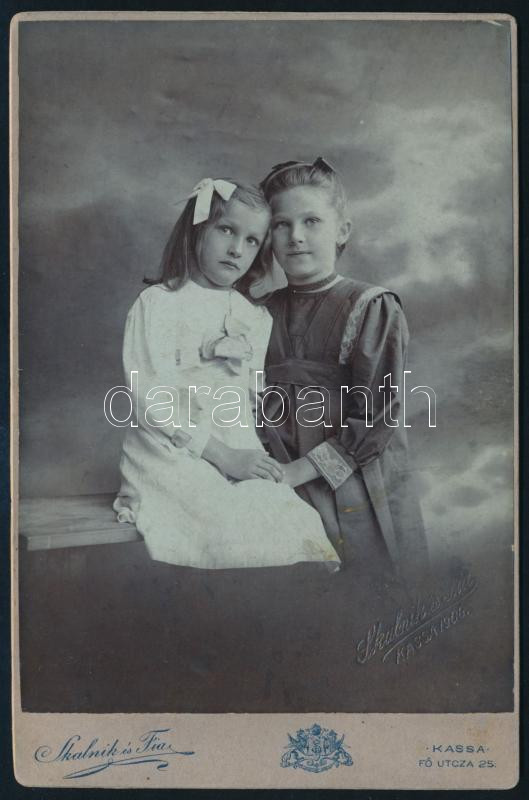 Leírás: 1908 Két kislány portréja, kabinetfotó Skalnik és Fia kassai műterméből, hátoldala kissé foltos, 16,5x10,5 cm