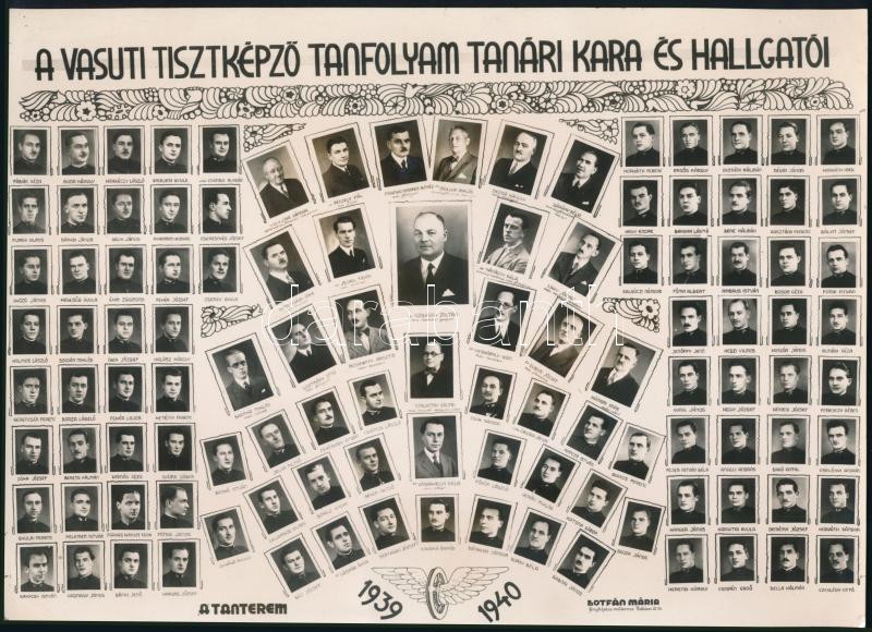 Leírás: 1940 A Vasúti Tisztképző Tanfolyam tanári kara és hallgatói, tablókép nevesített portrékkal Botfán Mária műterméből, 20,5×28,5 cm