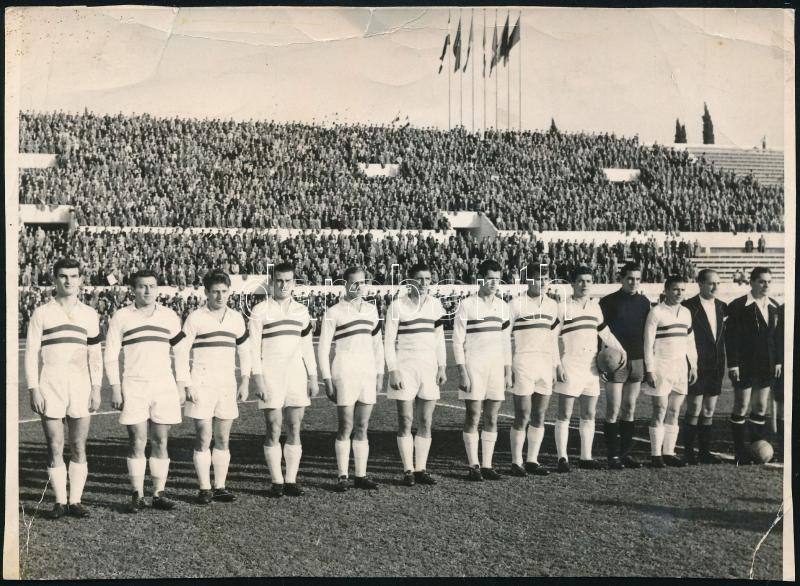 Leírás: 1953 Az Aranycsapat Belgrádban, fotó törésnyomokkal, szakadással, 12,5×17,5 cm