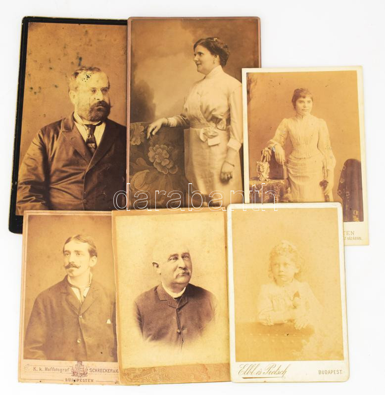 cca 1880-1900 Vegyes portrék, 6 db kabinetfotó, klf. műtermekből (Meinhardt Ágoston, Szabadka; Schrecker & Kalmár, Klösz György, ill. Elbl és Pietsch, Budapest; stb.), változó állapotban, 16x10,5 cm és 21,5x13,5 cm között