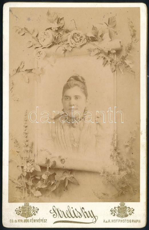 cca 1890-1900 Hölgy portréja, dekoratív virágos montázs, kabinetfotó S... https://www.darabanth.com/hu/504-Gyorsarveres/504.0/Fotomuveszet/Foto~1000005/cca-1890-1900-Holgy-portreja-dekorativ-viragos-montazs-kabinetfoto-Strelisky-budapesti-mute~II3337771