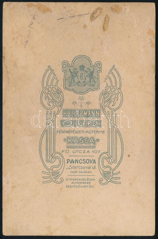 cca 1900-1910 Fiatal hölgy egészalakos portréja, kezében könyvvel, kabinetfotó a Kellermann Fivérek kassai műterméből, szecessziós verzóval, 16,5x10,5 cm (Ritka!)