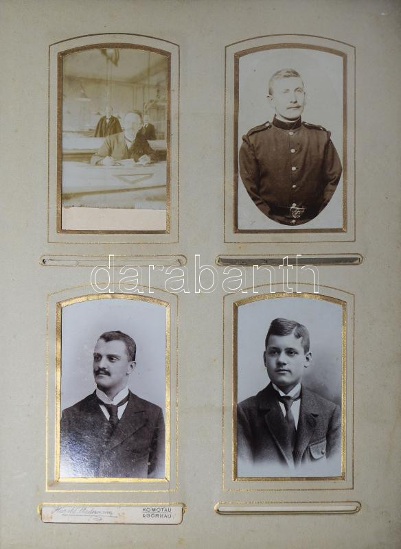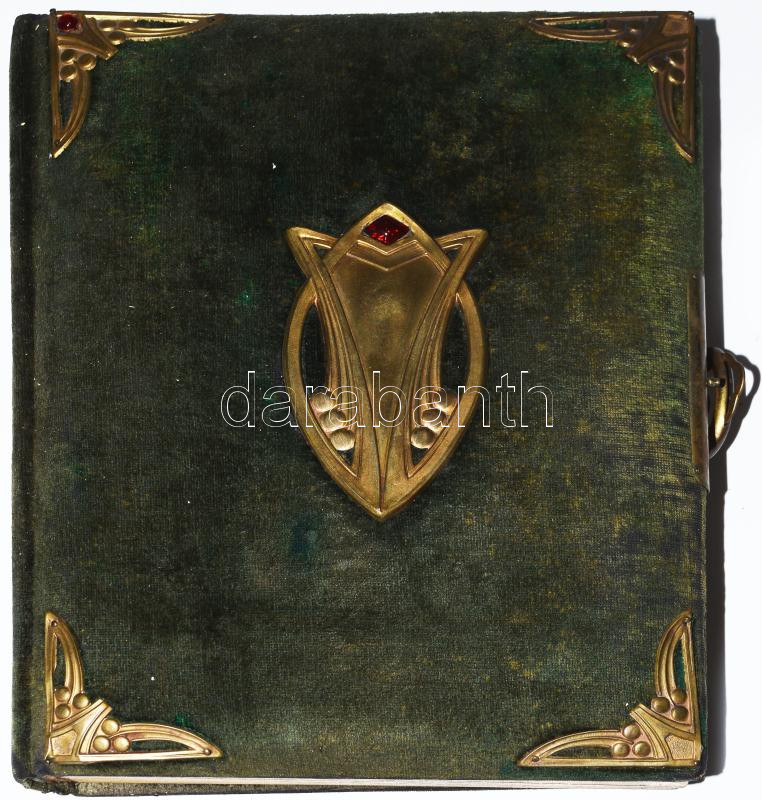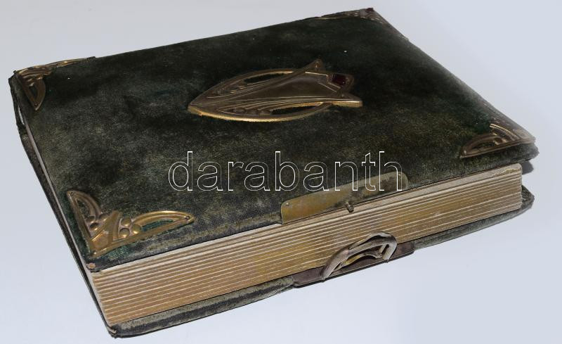 cca 1900-1910 Régi fotóalbum összesen 17 db keményhátú fotóval (vizitkártyák, kabinetfotók), többségében külföldi (osztrák, cseh) műtermekből, közte néhány magyarral (Rembrandt, Győr; Békei Ödön, Bp.), szecessziós fémveretekkel díszített, zöld bársonyborítású, kapcsos albumban, kissé viseltes borítóval, helyenként sérült albumlapokkal, 27,5x21x6 cm