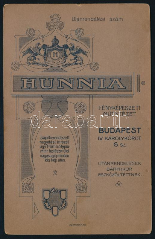 cca 1910 Elegáns fiatal lány portréja, kabinetfotó a budapesti Hunnia műteremből (a verzón nyomdahibával/elírással: ,,Fényképészeti Mütntézet"), 16,5x10,5 cm