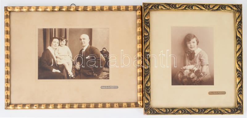 cca 1930 Családi fotók, 2 db kartonra kasírozott fotó Bauer Ágoston rákospalotai fényképész műterméből, mindkettő korabeli, dekoratív üvegezett keretben (az egyik hátoldalán Kele László rákospalotai képkeretező címkéjével), fotó: 12,5x17 cm és 14,5x10,5 cm, külső méret: 25x33,5 cm és 27,5x24,5 cm